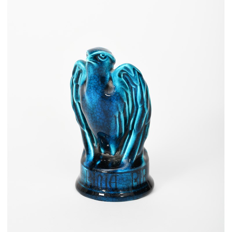 A Bernard Moore model of an eagle, on circular base inscribed The Binia Bird, glazed blue, signed Bernard Moore, repair to base, 12.5cm. high