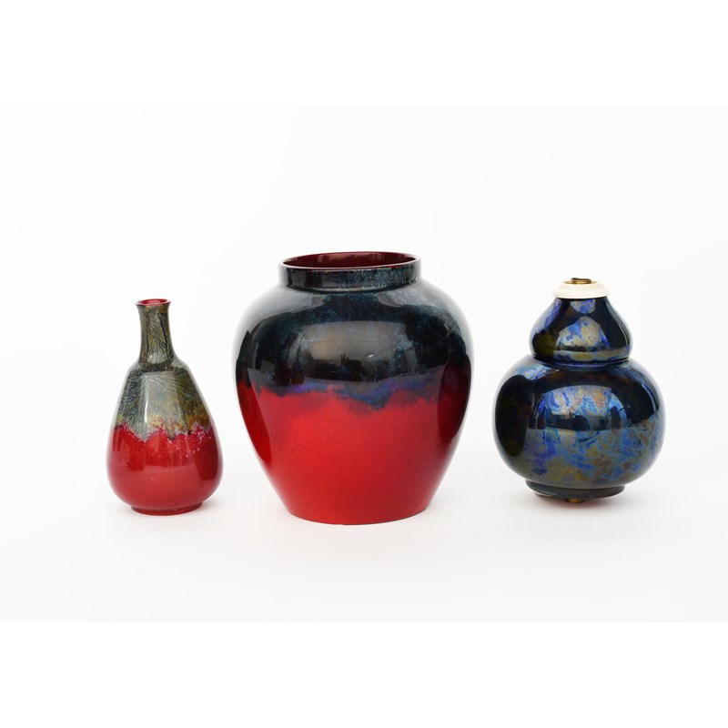 A Bernard Moore solifleur vase, shouldered form with cylindrical neck, flambe glaze, the neck with a band of crystalline, a Bernard Moore double gourd vase with electric light fittings and a Bernard Moore jar BM monogram, 13cm. high (3)