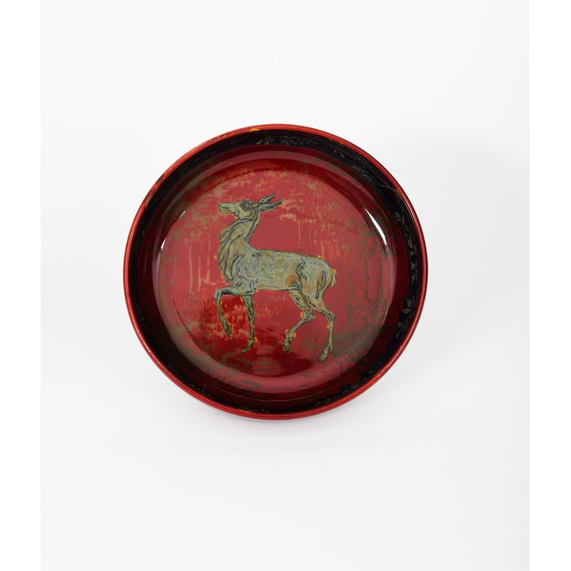 A Bernard Moore flambe bowl, decorated to the well with a deer walking in a woodland setting, in