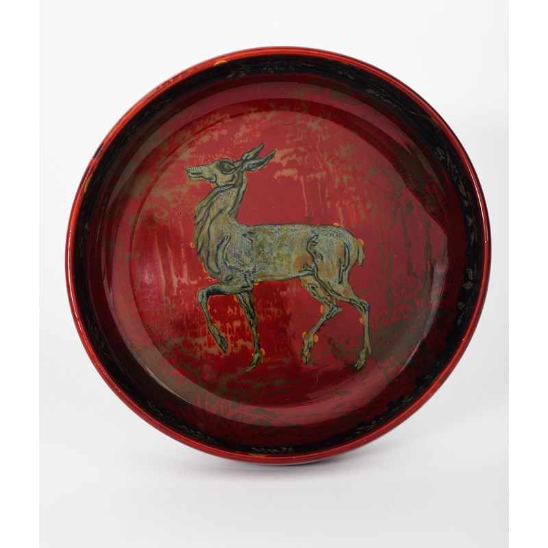 A Bernard Moore flambe bowl, decorated to the well with a deer walking in a woodland setting, in blue and yellow on a flambe ground, signed Bernard Moore and artist monogram, 24cm. diam.