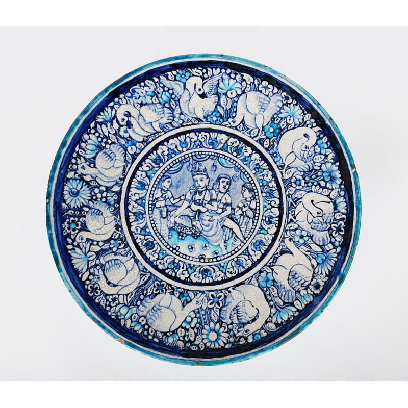 A Bombay School of Art Wonderland Pottery charger, painted to the well with a deity resting, the rim with a frieze of geese and flowers, in blue and white, painted marks, glaze loss, 47cm. diam.