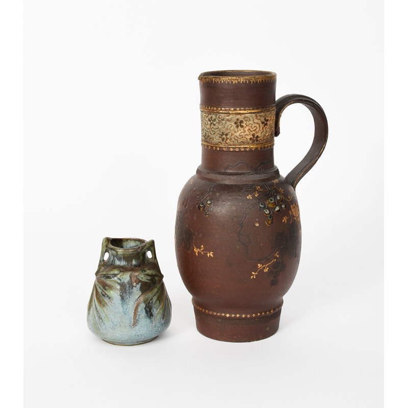 A Haviland & Cie Japoniste ewer by Ernest Chaplet, slender, shouldered form, incised with butterflies flying past fruiting tree boughs, enamelled in colours, highlighted in gilt, the neck with a simple enamelled geometric band, and an Art Nouveau Denbac vase, impressed mark, 24cm. high (2)