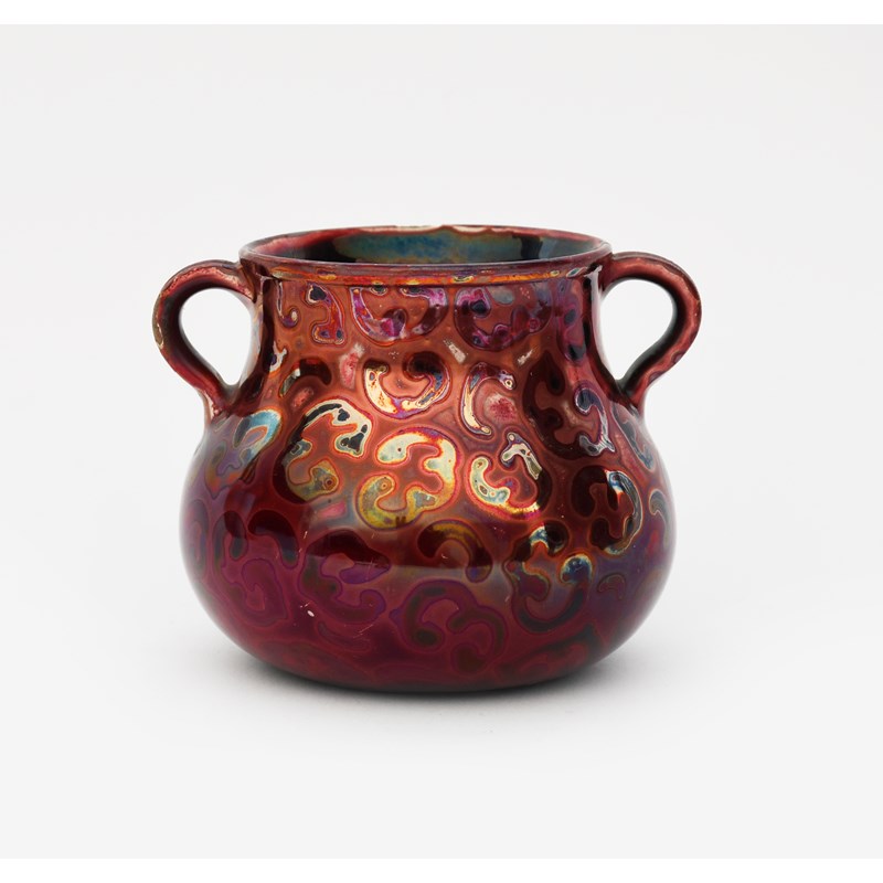 A Vallauris vase, shouldered, ovoid form with applied handles, painted with geometric design in gold and ruby lustre, indistinct painted marks, glaze chips, 8.5cm. high