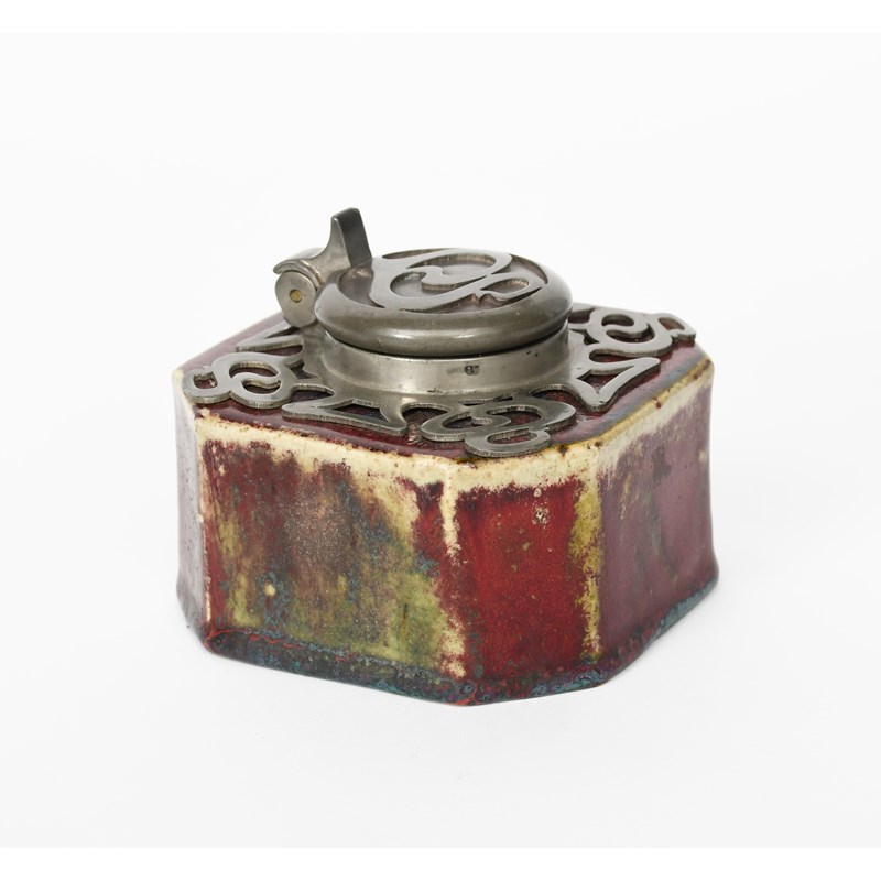 An Adrien Dalpayrat Gres stoneware inkwell with pewter mount, shaped, square section covered in a