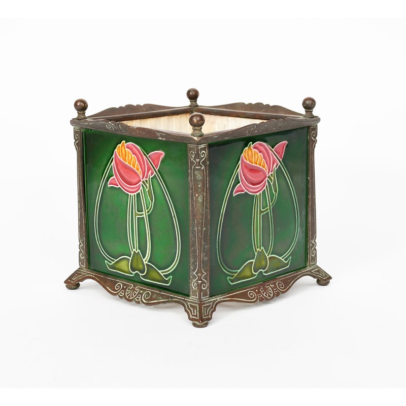 A cast bronze planter, square section, cast with simple foliate panels, set with four Art Nouveau dust-pressed tiles decorated with flower stems in pink and yellow on a green ground, unsigned, tiles stamped England, 20cm. high