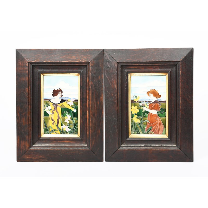 A pair of Art Nouveau tile plaques probably Johann von Schwarz, designed by Carl Luber, each decorated with an Art Nouveau maiden picking flowers in a stylised landscape, in colours, each in oak frame, incised 687 to reverse, 19.5 x 12cm (2)