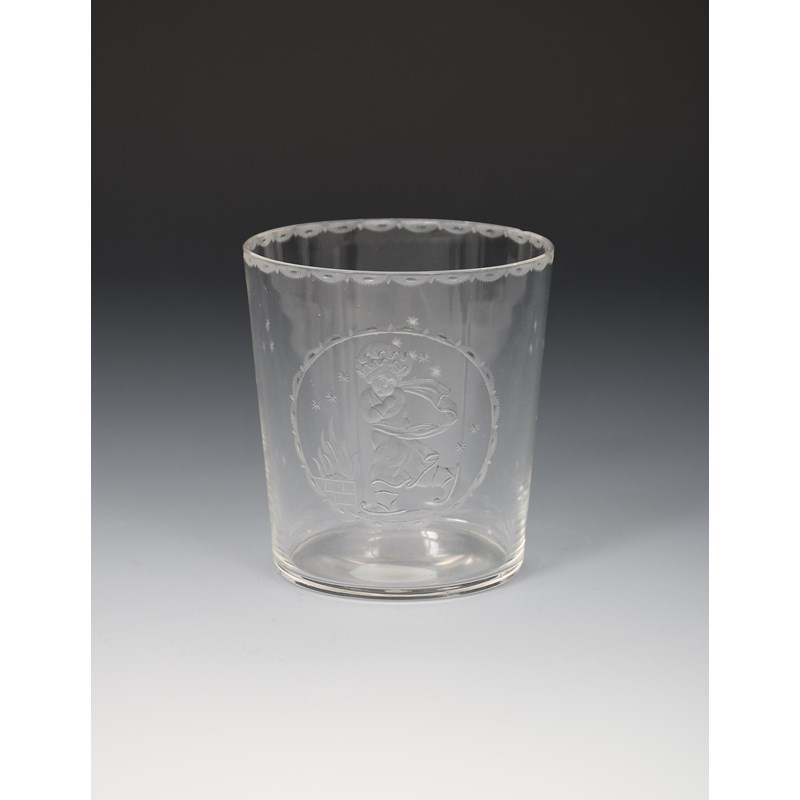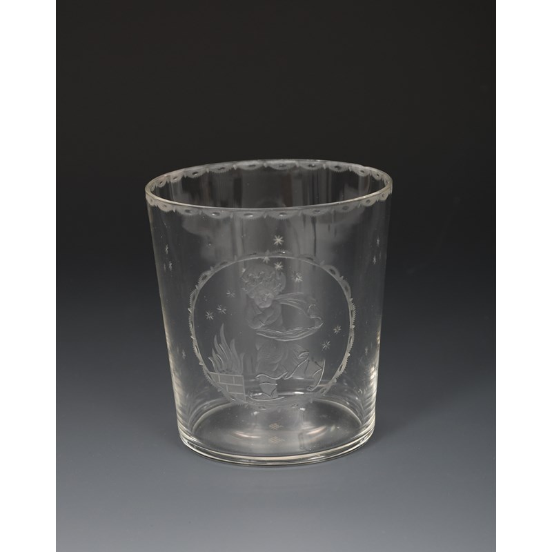 A Lobmeyer engraved vase designed by Michael Powolny, flaring cylindrical form, engraved with a young child on ice-skates standing next to a fire to keep warm, etched Lobmeyer mark, small nick to top rim, 8.5cm. high