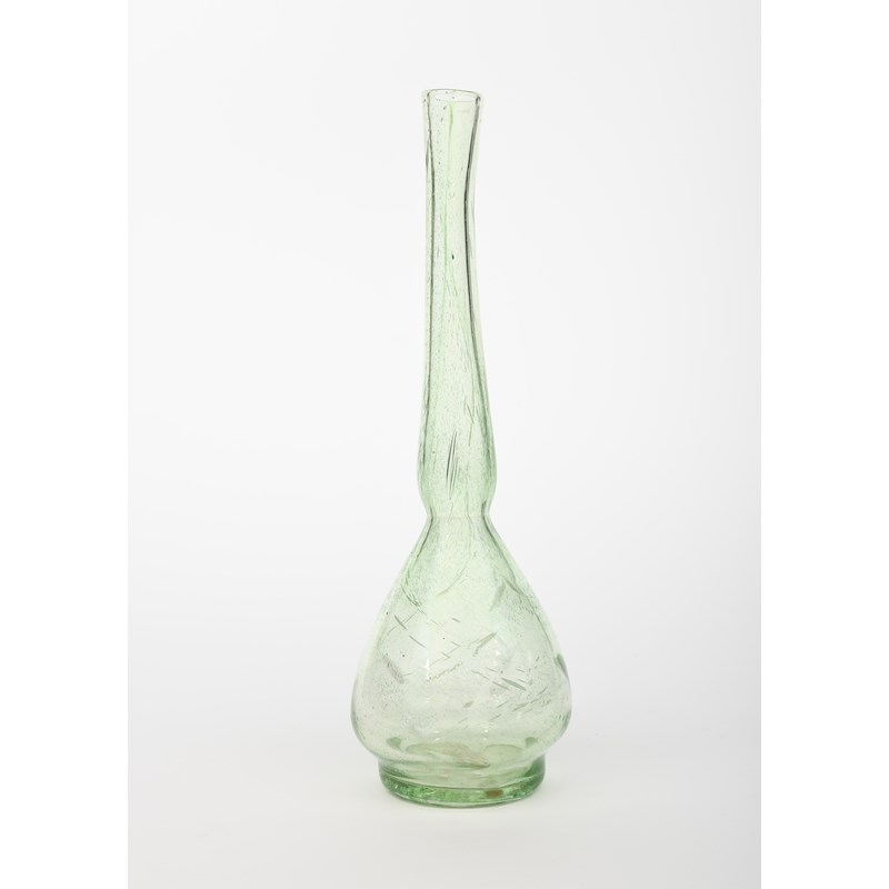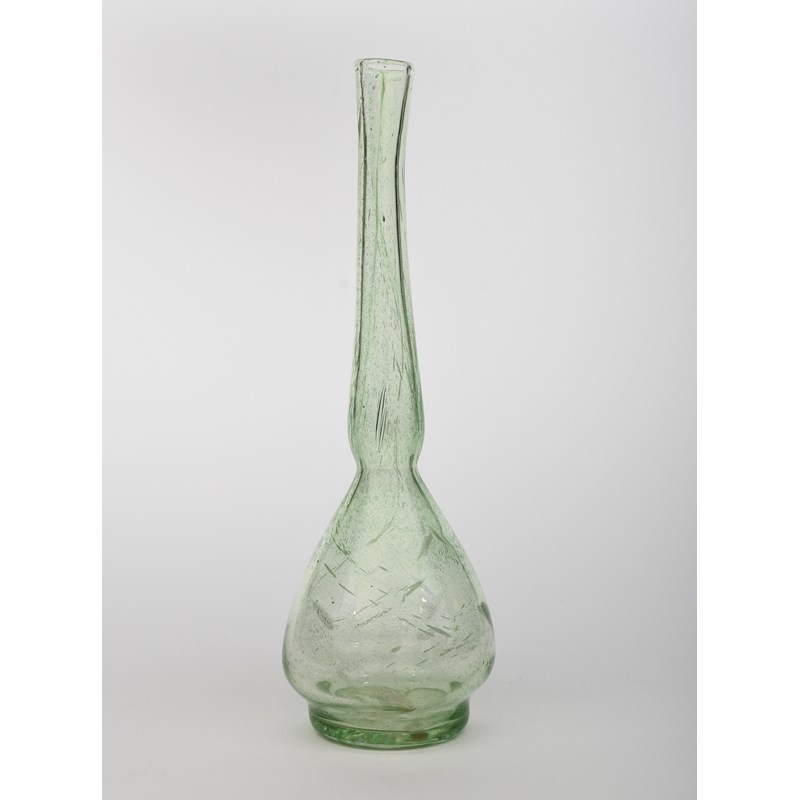 A tall green glass vase in the manner of James Couper & Sons Clutha glass, pulled ovoid body with tall slender neck, pale green glass with white striations and bubbles, unsigned, 39.5cm. high