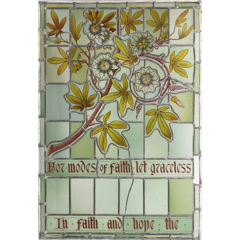 Two stained glass window panels, one painted with passionflower stems above inscription How modes of