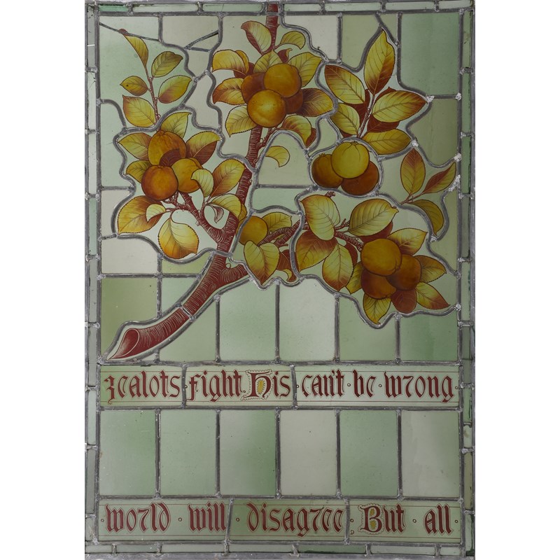 Two stained glass window panels, one painted with passionflower stems above inscription How modes of faith let graceless, the other decorated with a fruiting bough, with inscription Zealots Fight his cant be wrong, unsigned, 93 x 63cm. (2)