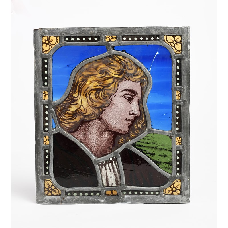This small stained glass panel by Harry Mileham (1873-1957) is a detail of a full sized window made in 1935 for St Andrew's Church Hove, depicting King David the musician / harpist. It was in memory of H. W. Yeats, violinist.