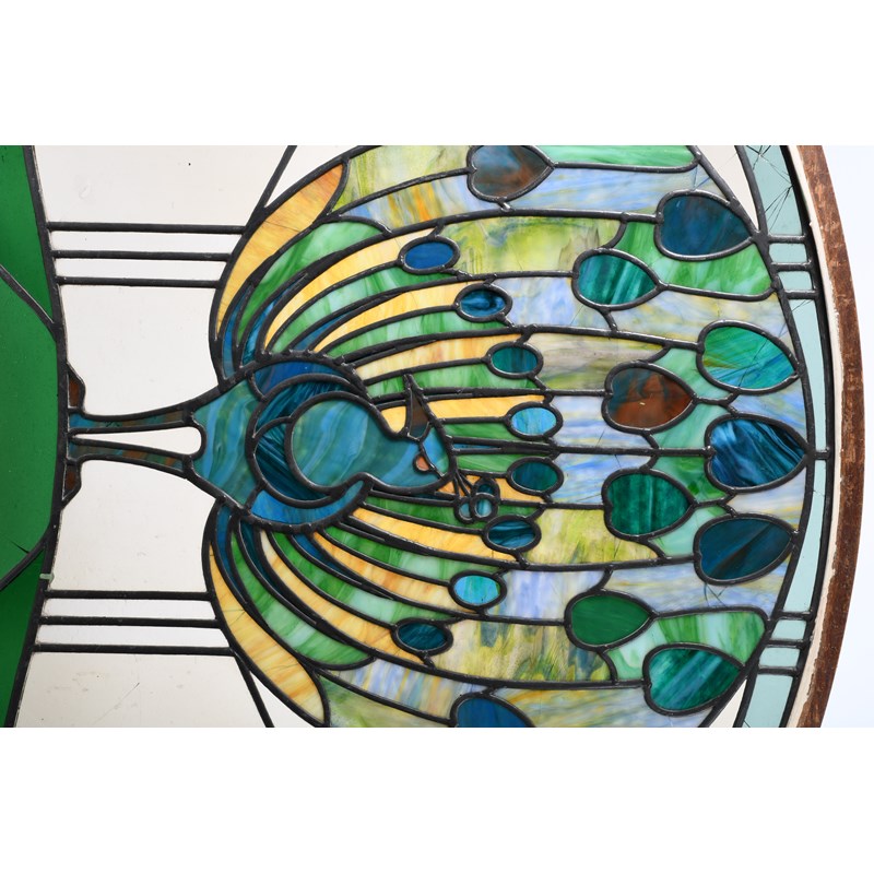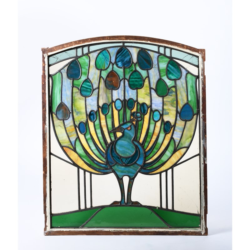 A stained glass Peacock window, rectangular with rounded top, decorated with a peacock displaying