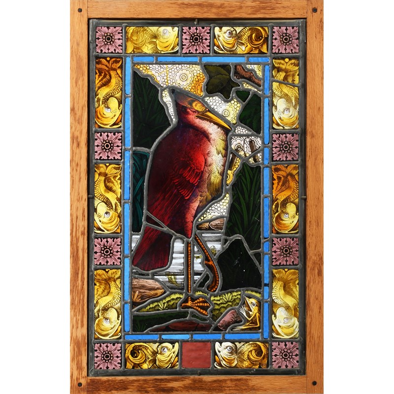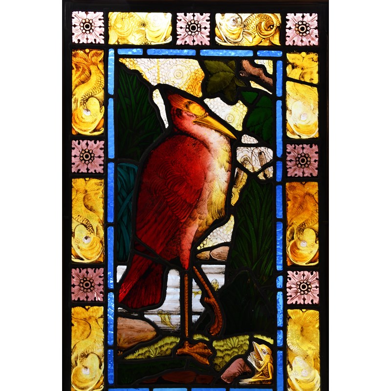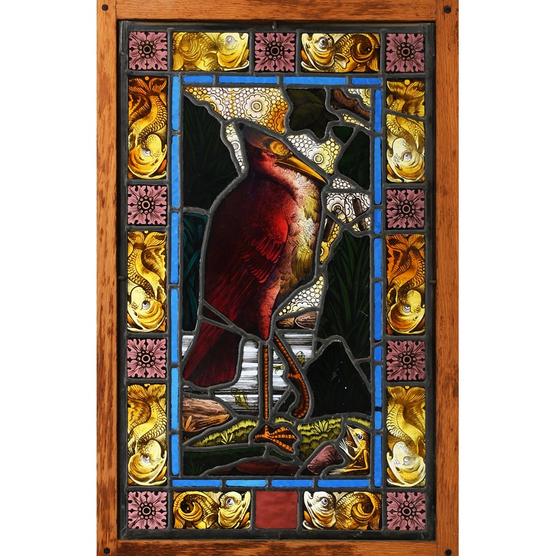 An Aesthetic Movement stained glass window the design attributed to George Edward Cook, rectangular, decorated with a crane standing before a frog, fish swimming in the water in the distance, inside a border of scaly fish and square foliage quarries, inside an oak and ebony frame made by Peter Cornish, unsigned, 65 x 42cm.