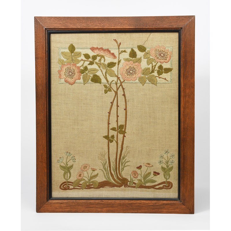 An Art Nouveau silk embroidery possibly retailed by Liberty & Co, rectangular, embroidered with dog rose flowers on long entwined thorny stems, in oak frame, unsigned, 66 x 54cm. (frame)