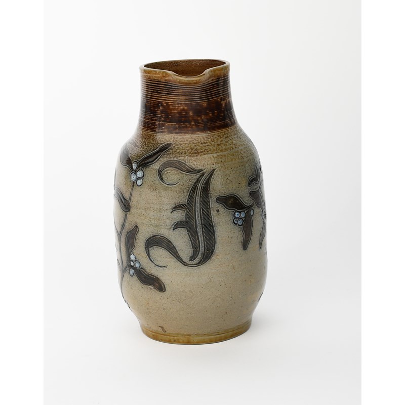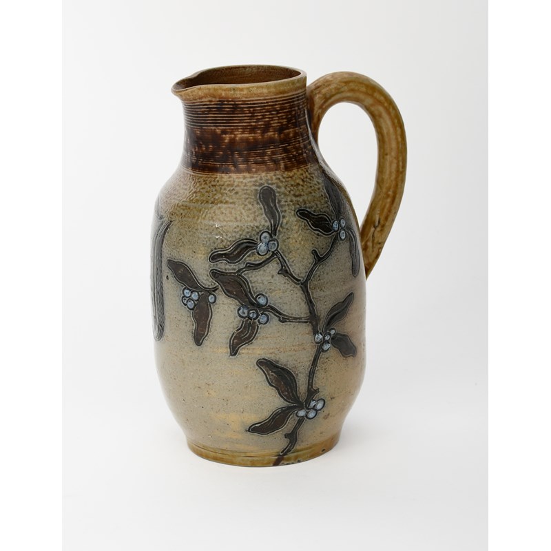 A Martin Brothers stoneware jug by Robert Wallace Martin, dated 1880, shouldered form, incised and painted with sprays of mistletoe, in ochre and white on a buff ground, incised 23.9.80, R W Martin, London & Southall, 20.5cm. high