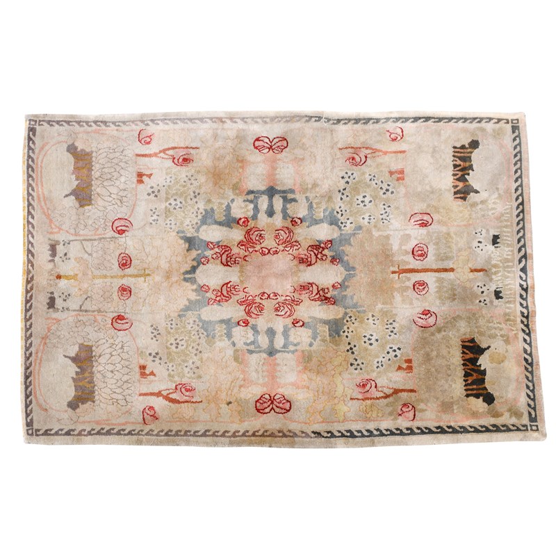 A large woven rug in the manner of Mackay Hugh Baillie Scott, rectangular with central standard rose motif, above stylised trees, each corner with a grazing rabbit unsigned, 303 x 217cm
