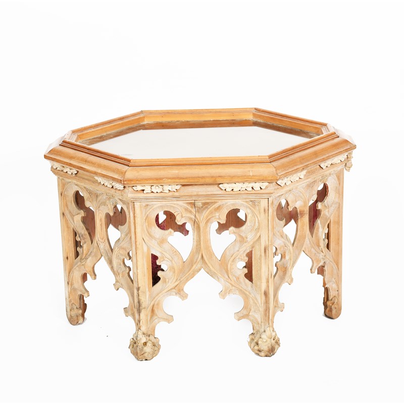 A Gothic Revival pine table, octagonal section over tracery legs, the top inset with mirror glass,