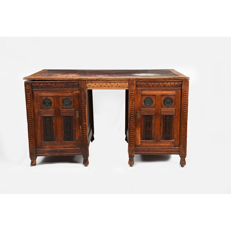 A Gothic Revival pitch pine pedestal desk, twin fitted pedestals, with large rectangular top set with writing leather, carved and marquetry panels, unsigned, 140 x 98cm, 80cm high (3)
