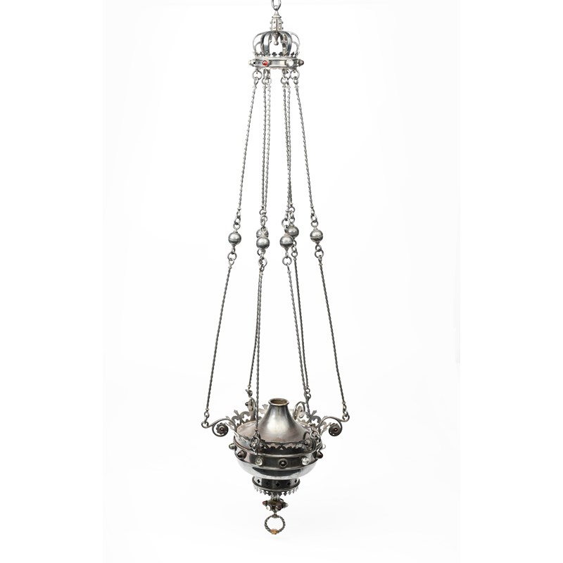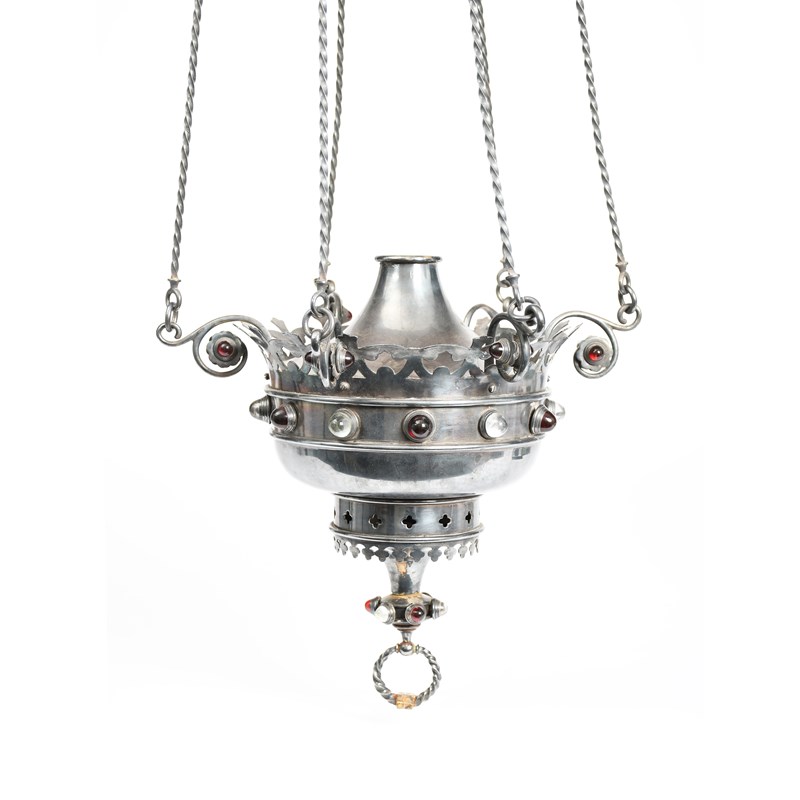 A polished metal hanging oil lamp in the manner of Bruce Talbert, with pierced trefoil gallery, set with moonstone and red glass cabochon, on twisted hanging rods with crown, unsigned, 113cm. high