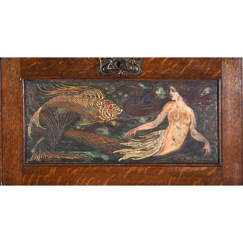 A large oak overmantel by Edgar Wood, rectangular, two open shelves flanking central cupboard with hinged door, the door decorated with a gesso panel of a mermaid and fish, with overhanging mantel with plate rack groove, patinated door furniture and candle arms to each side, unsigned,