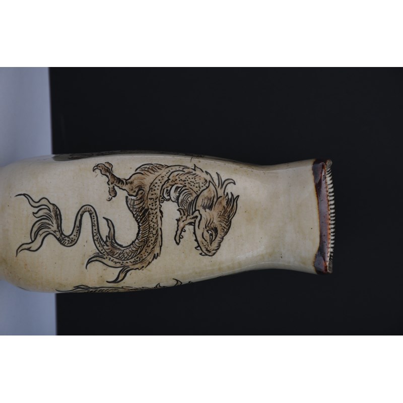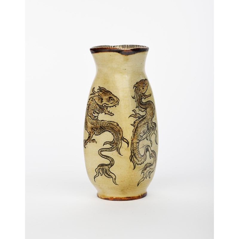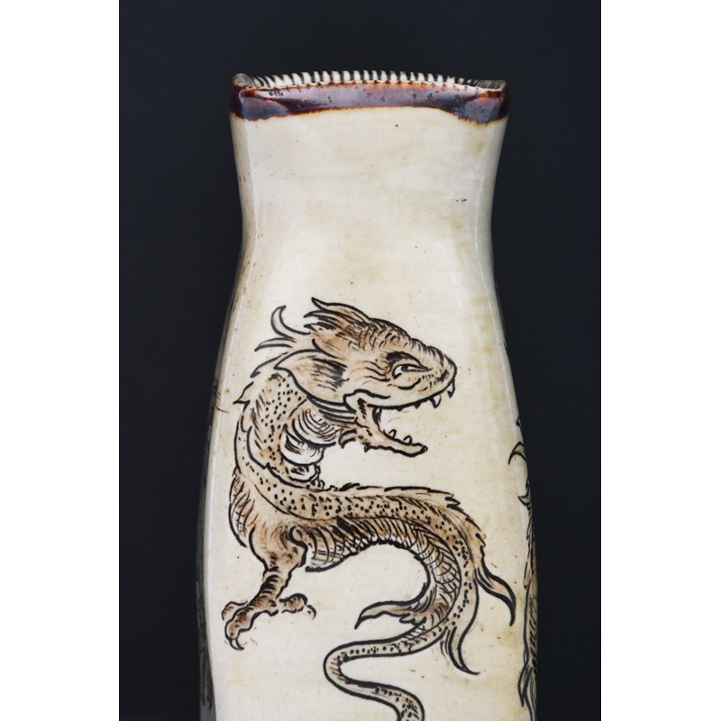 A Martin Brothers stoneware grotesque Aquatic vase by Edwin and Walter Martin, dated 1896, shouldered square section, incised and painted to each side with a grotesque fish-like reptile, in ochre on a buff ground, incised 11-1896, Martin Bros, London & Southall, 18.5cm. high