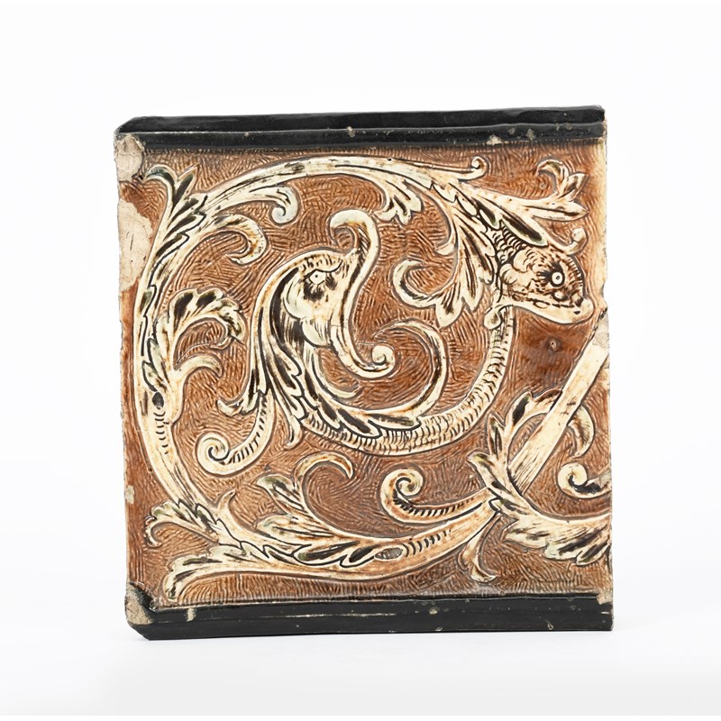 A Martin Brothers stoneware architectural tile, modelled in low relief with scrolling classical beasts, in chestnut brown on an oatmeal ground, unsigned, 15 x 16cm.