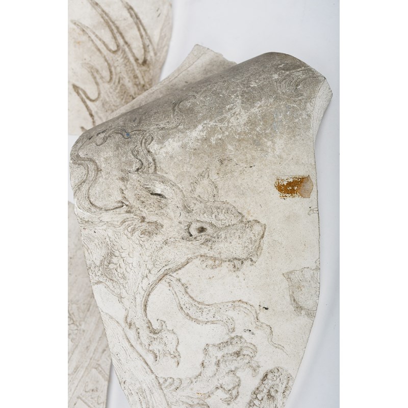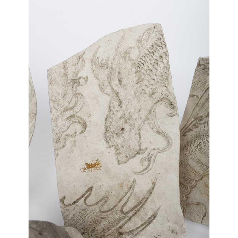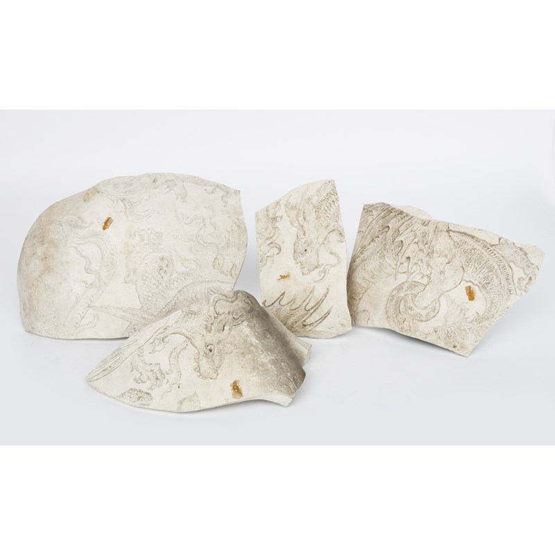 Four Martin Brothers stoneware Dragon fragments by Robert Wallace Martin, from a large jardiniere,