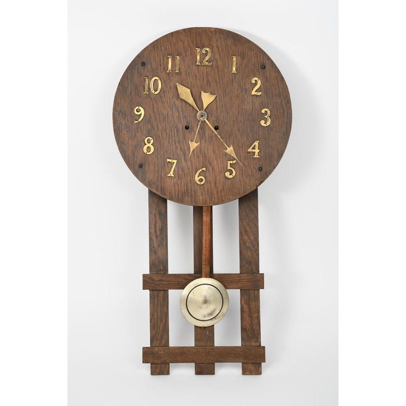 An oak wall clock, circular dial with applied brass Arabic numerals, trellis back, with pendulum,