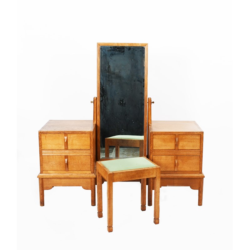 A Gordon Russell oak dressing table, with matched stool, two drawer plinths with central rectangular mirror, on eight octagonal legs, unsigned, 136cm. high