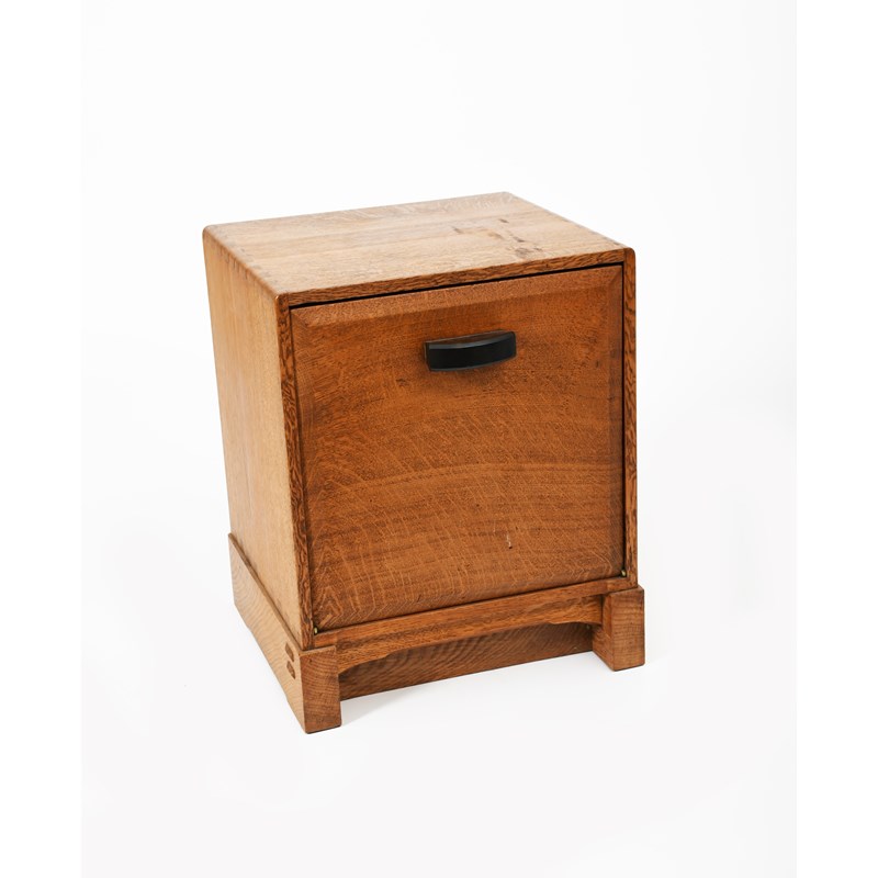 An oak coal box the design attributed to Stanley Webb Davies, rectangular with ebonised wood handle, with fall front, fitted tin interior, unsigned, 52cm high, 41cm wide