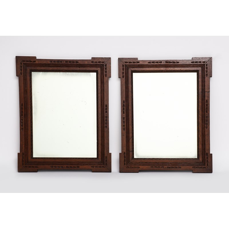 A pair of Liberty & Co oak wall mirrors, shaped, rectangular form with chip-carved decoration, impressed Liberty mark and regd number, 52.5 x 42.5cm. (2)