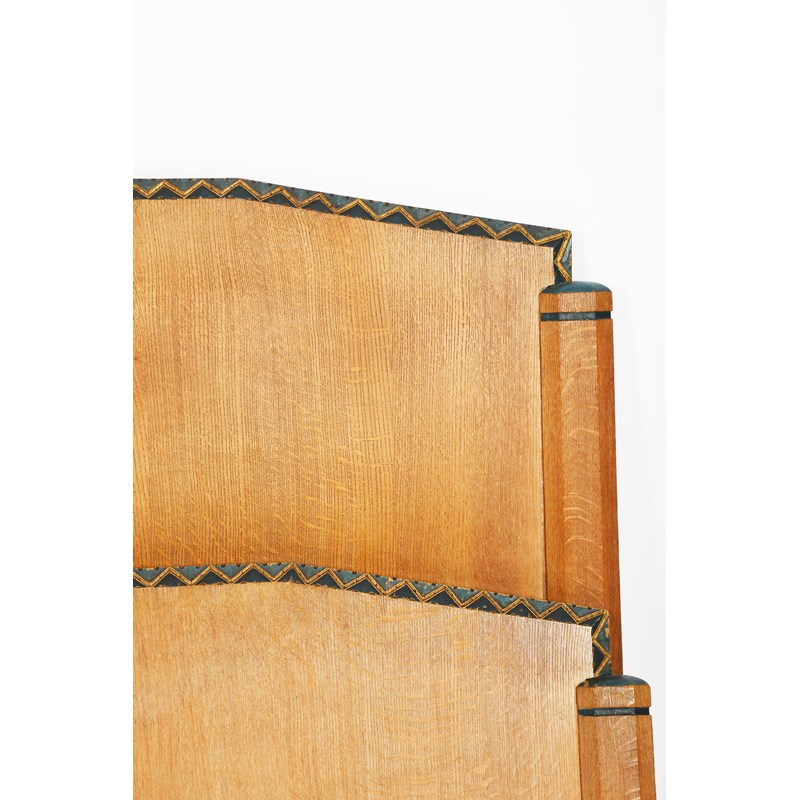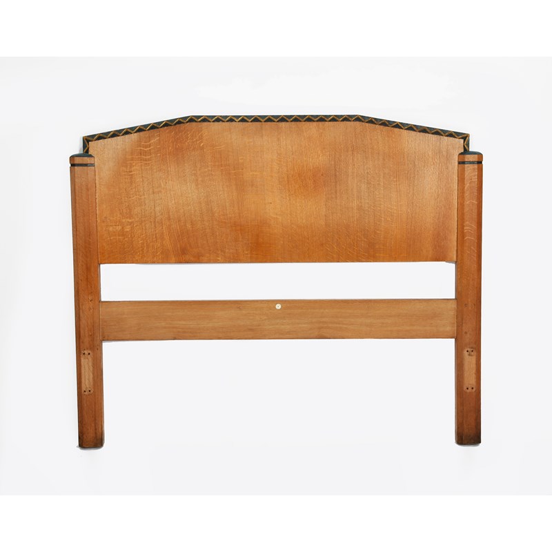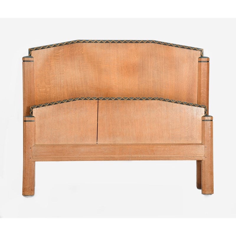 A Heal & Son oak double bed, the head and foot board with carved and painted blue chevron bands,