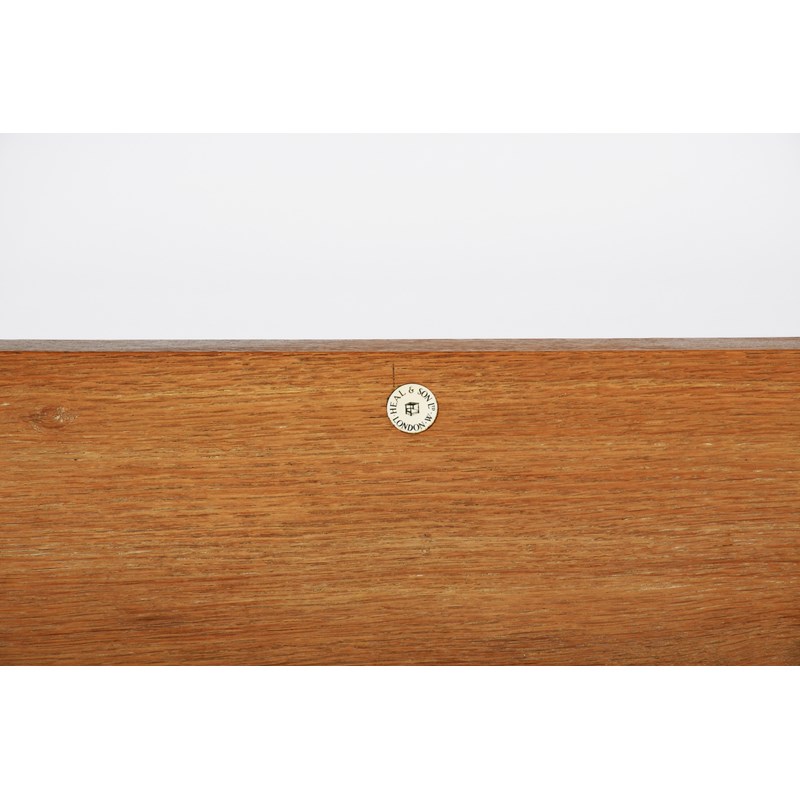 A Heal & Son oak double bed, the head and foot board with carved and painted blue chevron bands, metal frame, applied ivorine Heal's disc, 139cm wide, 117cm high (3)