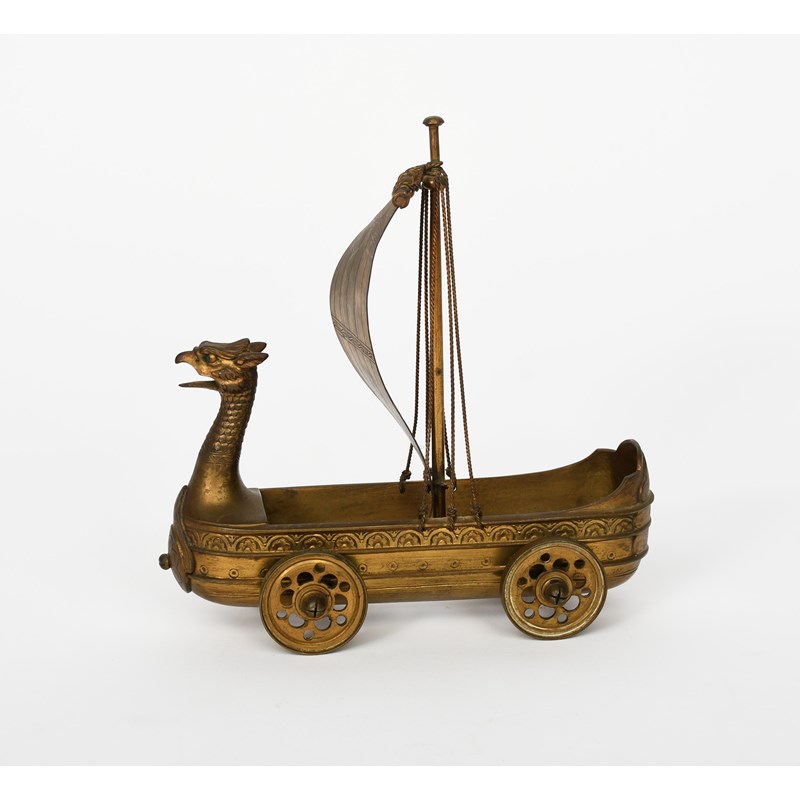 A Cox & Sons gilt brass nef designed by Bruce Talbert, modelled as a longboat with single sail and birds head figurehead, on four wheels, unmarked, 20cm wide, 20.5cm. high