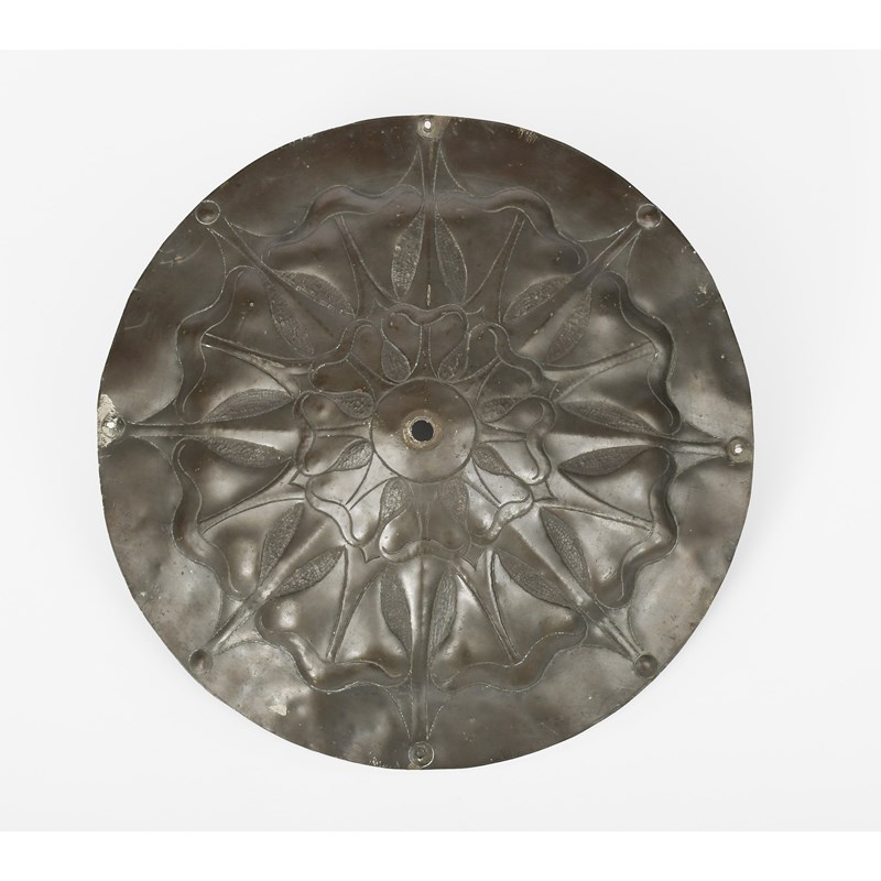 A rare Guild of Handicraft pewter ceiling rose designed by Charles Robert Ashbee for the Magpie and Stump, circular, stamped with Tudor rose flower head, and another, possibly a pendulum shade modelled as a flower head the design attributed to Charles Robert Ashbee, unsigned, 31cm. diam. (2)