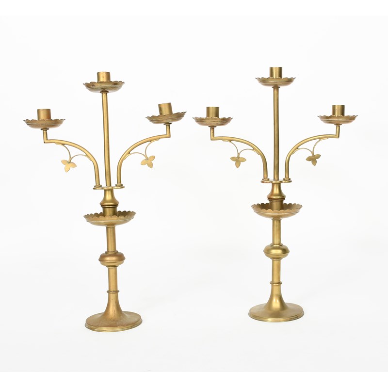 A pair of John Hardman & Co brass three branch candelabra, the knopped stem, with flaring
