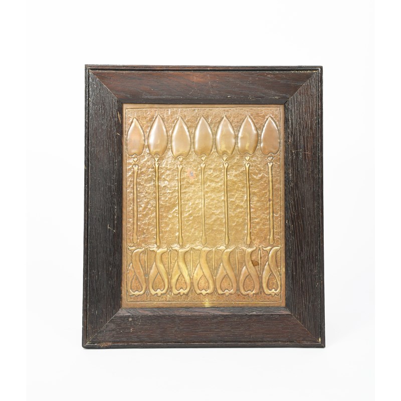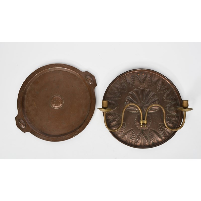 An Artificers Guild copper twin-handled tray, stamped central floral roundel, the rim with stamped foliate repeat and punched decoration, a patinated brass Art Nouveau panel, and a copper and brass twin-branch wall sconce in the manner of Benham & Froud stamped marks, 41cm. wide (3)