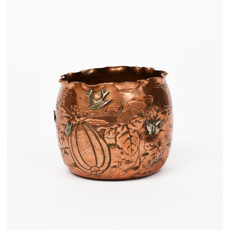 A Keswick School of Industrial Arts brass charger, the well stamped and hammered with a longboat sailing on a rough sea, the rim with a frieze of stylised flower stems and a Gorham & Co mixed metal vase, unsigned, 57cm. diam. (2)