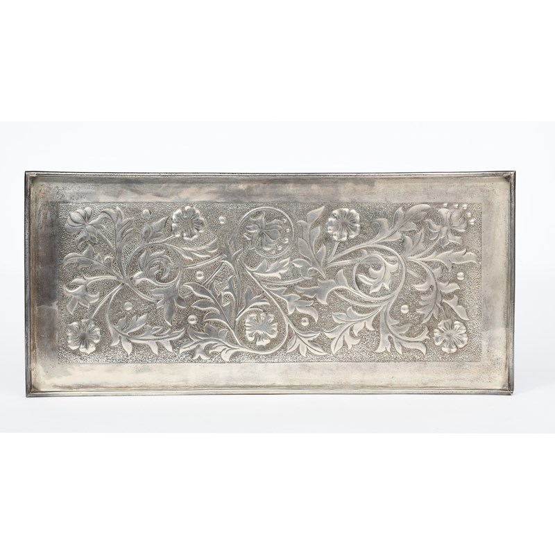 A rare Keswick School of Industrial Arts silver tray by Jeremiah Richardson, rectangular, hammered in low relief with scrolling flowers and foliage panel, etched Jeremiah Richardson and possible 1890 date to back, 54 x 24.5cm.