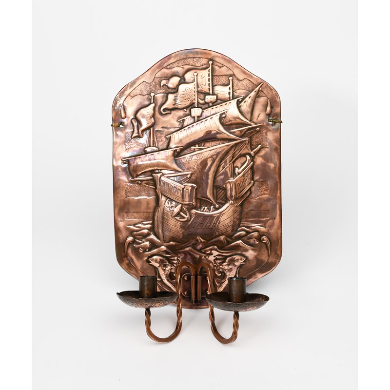 A large Newlyn Industrial Classes patinated copper double wall sconce, the shaped rectangular back plate hammered in low relief with a ship at full sail, above two leaping scaly fish, with two articulated sconces, stamped Newlyn, 45cm. high