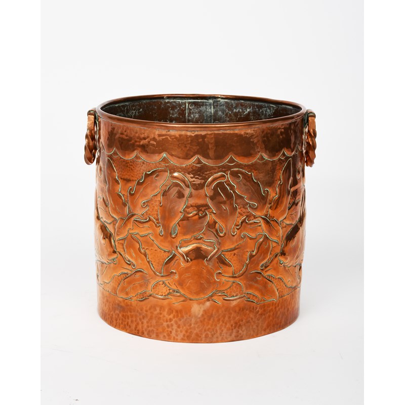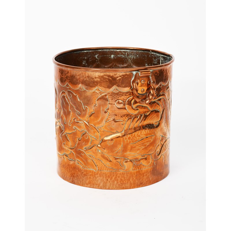 A large Newlyn Industrial Classes copper ice bucket, cylindrical with applied twist handles, the body hammered in relief with large scaly fish swimming amongst waterweed, unsigned, 20.5cm. high