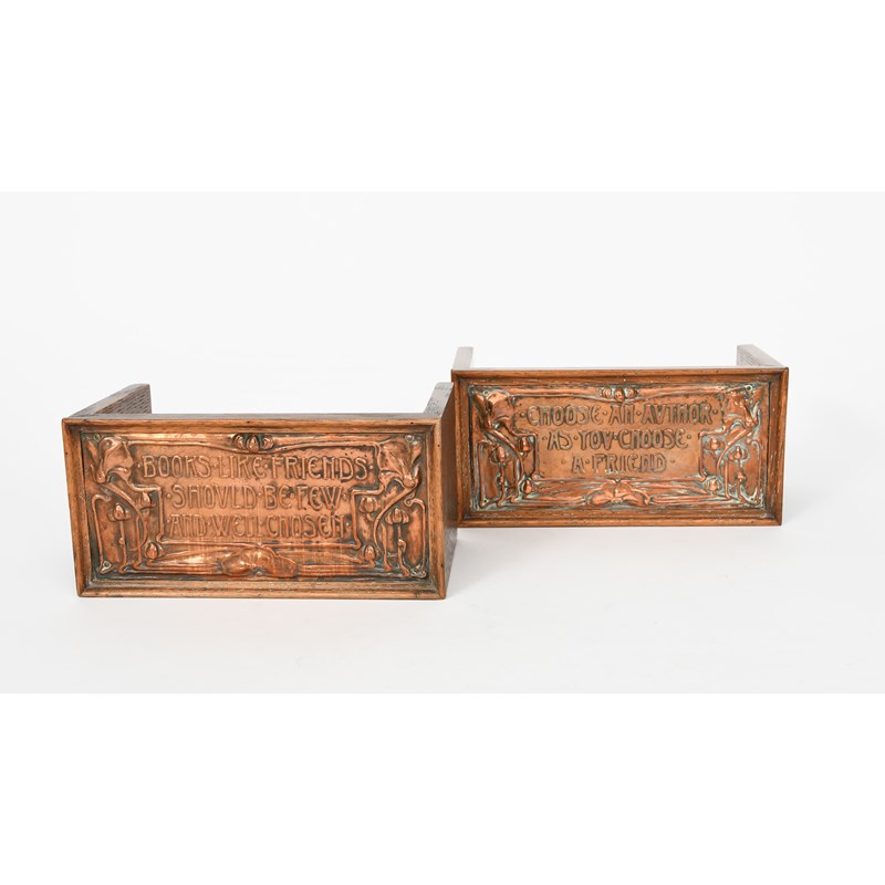 A pair of Shapland and Petter oak book stands, each rectangular applied with a copper plaque inscribed Choose an author as you choose a friend and Books like friends should be few and well chosen, unsigned 26cm. wide (2)