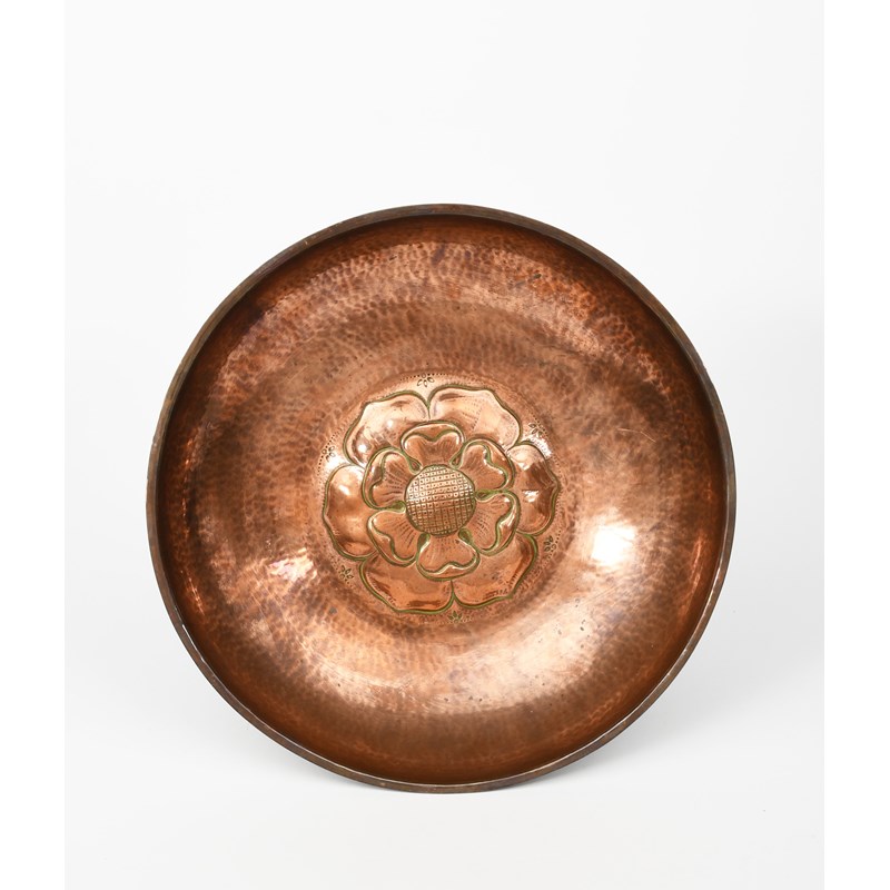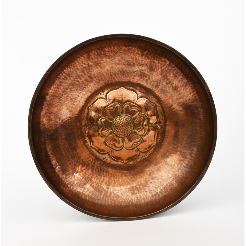 A Hart & Huyshe Guild of Handicraft copper bowl, circular with repousse hammered Tudor rose, on