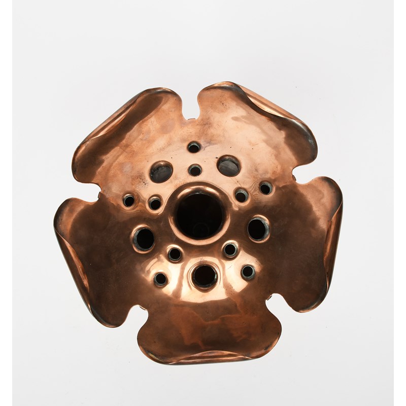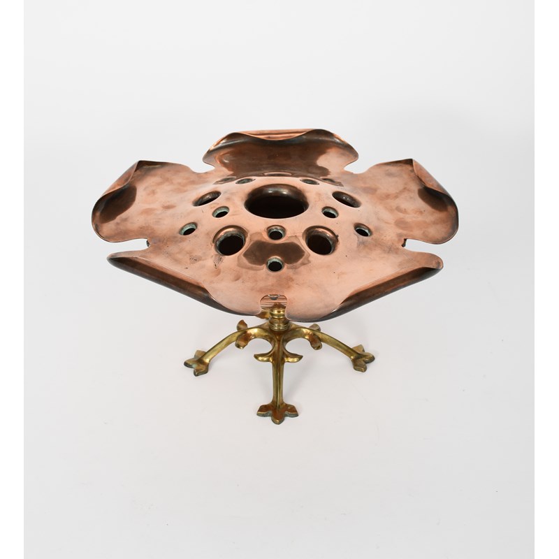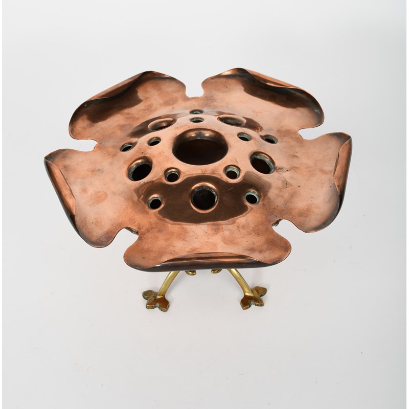 A WAS Benson copper and brass rose bowl and cover, brass cruciform foliate foot supporting flaring