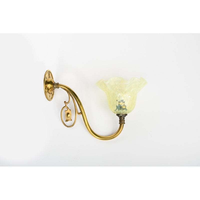 An Art Nouveau brass wall light with John Walsh Walsh vaseline glass shade, with scrolling foliate