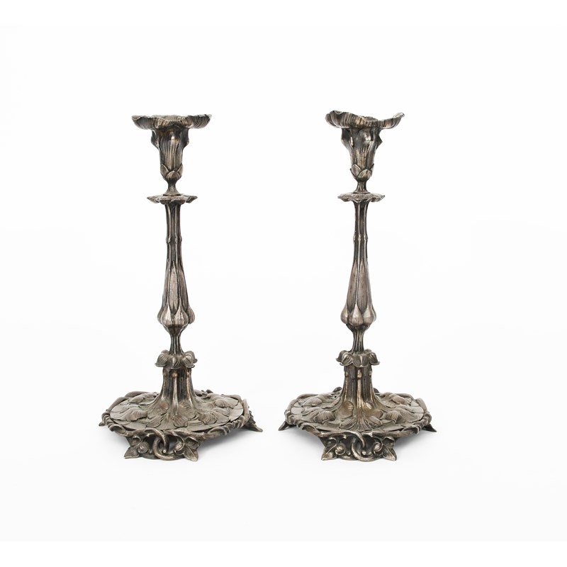 A pair of silvered bronze candlesticks, each on flaring circular foot, cast in low relief with radiating leaves central floriform stem and flaring bowl, one stamped 9, 26.5cm. high (2)