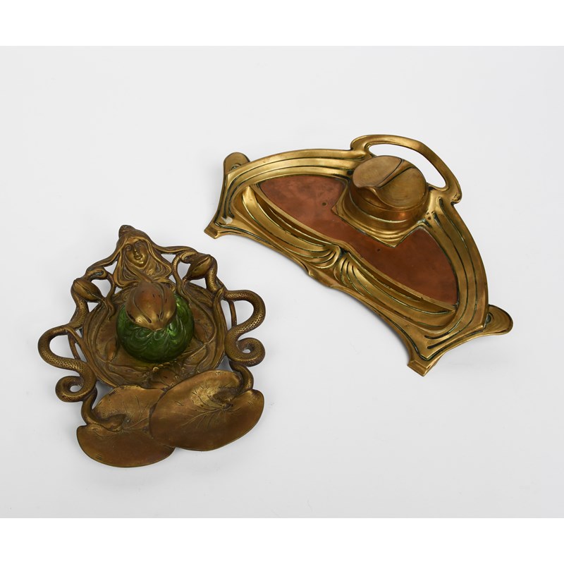 An Art Nouveau cast brass inkwell with Austrian iridescent glass well, in the manner of Gurschner, cast in low relief with a maiden amidst water-lily pads, another Jugendstil brass and copper inkwell, an Art Nouveau pewter and glass claret jug and an Art Nouveau electroplated biscuit box and cover with engraved glass liner, cast Geschlitz mark, 20.5cm. wide (6)