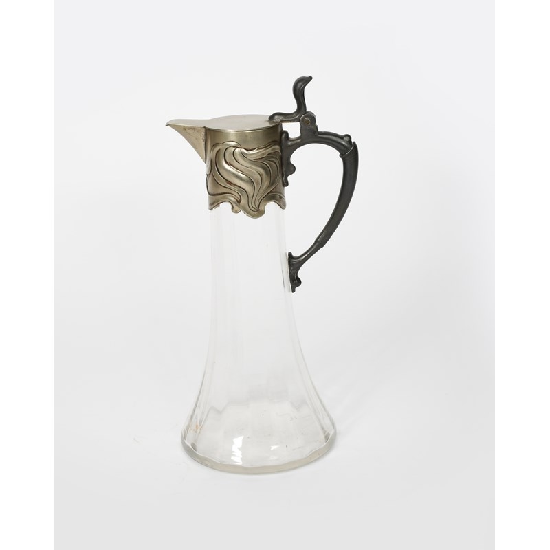 An Art Nouveau silvered metal and glass claret jug, in the manner of WMF, the tapering, faceted clear glass body with collar rim cast in low relief with Art Nouveau foliate design, hinged cover and pewter handle, stamped NS, 31cm. high