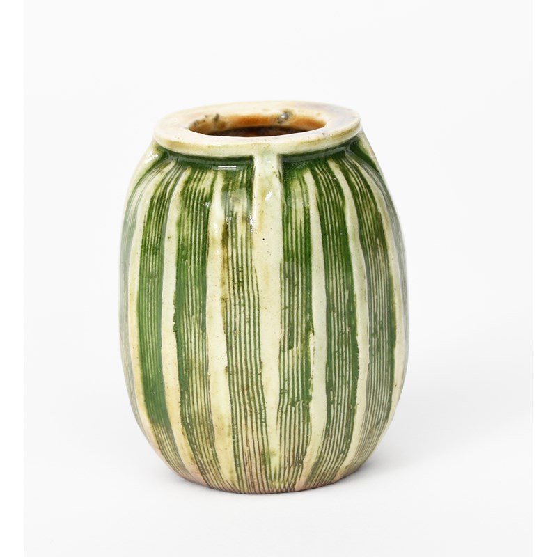 A Martin Brothers stoneware gourd vase by Edwin and Walter Martin, dated 1904, shouldered, cylindrical form, incised with fine vertical lines, glazed green over buff, incised 1-1904 Martin Bros London & Southall, 7.6cm. high