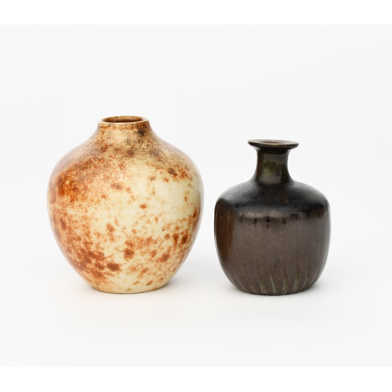 A Martin Brothers stoneware miniature gourd vase by Edwin and Walter Martin, dated 1899, shouldered ovoid form, with incised vertical ribs, glazed deep chestnut brown, and another Martin Brothers stoneware vase, ovoid with mottled grey and brown glaze, incised 3-99, Martin Bros, London, 6cm. high (2)